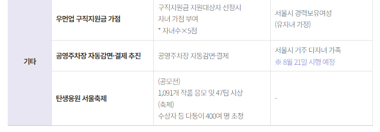 | 다둥이 행복타드 발급 | 공공시설 이용료 감면, 협력업체 할인 | 서울시 주민등록 등록된 다자녀 가구 (자녀 한 명이 18세 이하일 것) |
